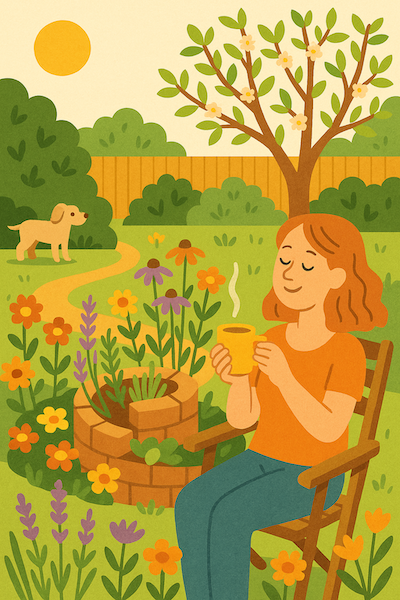In de tuin hoef je even helemaal niets. Je kunt gewoon zijn. Misschien loop je met je kopje thee een rondje, voel je de zon op je gezicht, hoor je het gezoem van een bij of het zachte geritsel van blaadjes in de wind. Je kijkt of er al iets gegroeid is. Een nieuwe bloemknop misschien, of een tomatenplantje dat nét boven de grond uit piept.